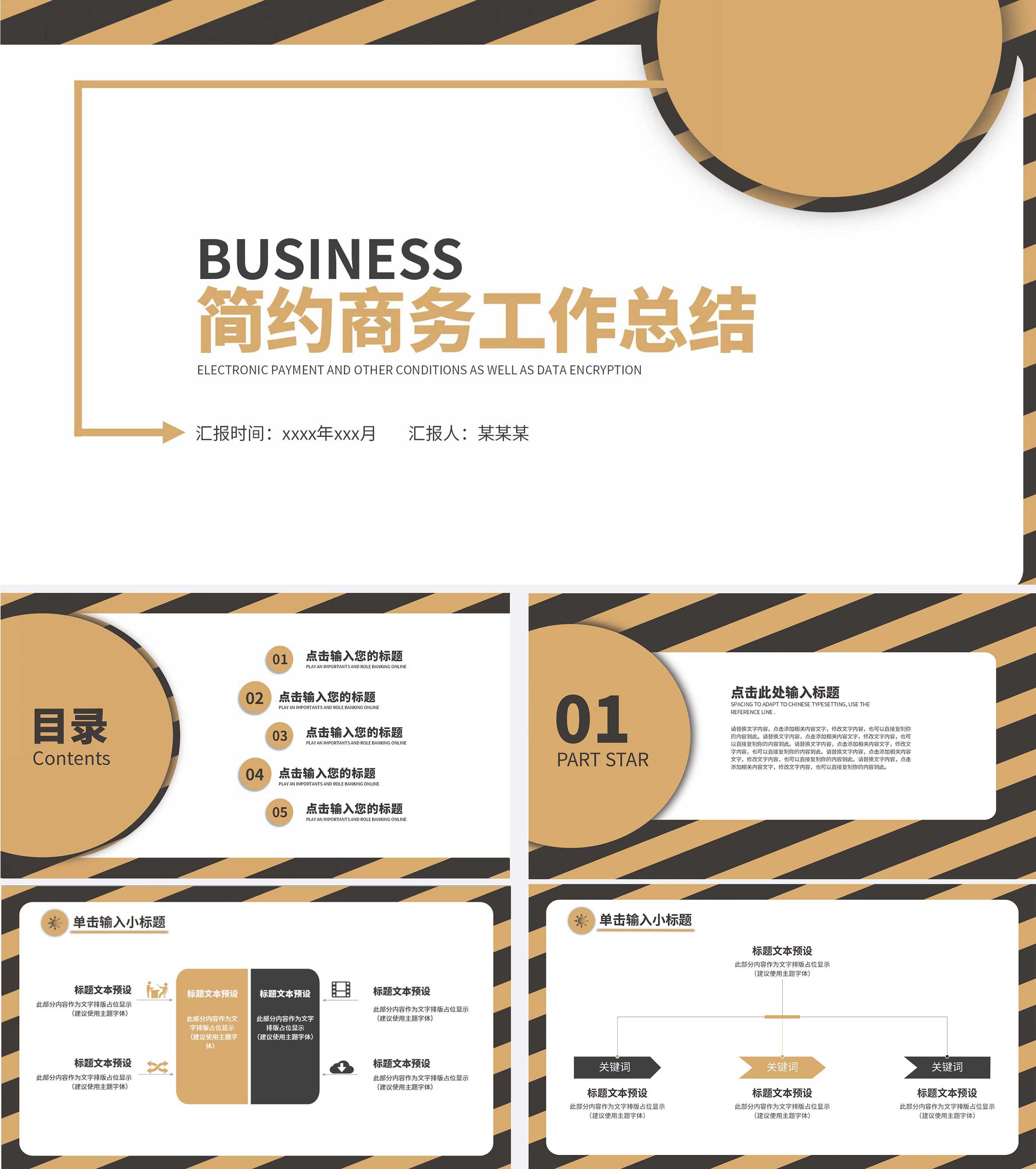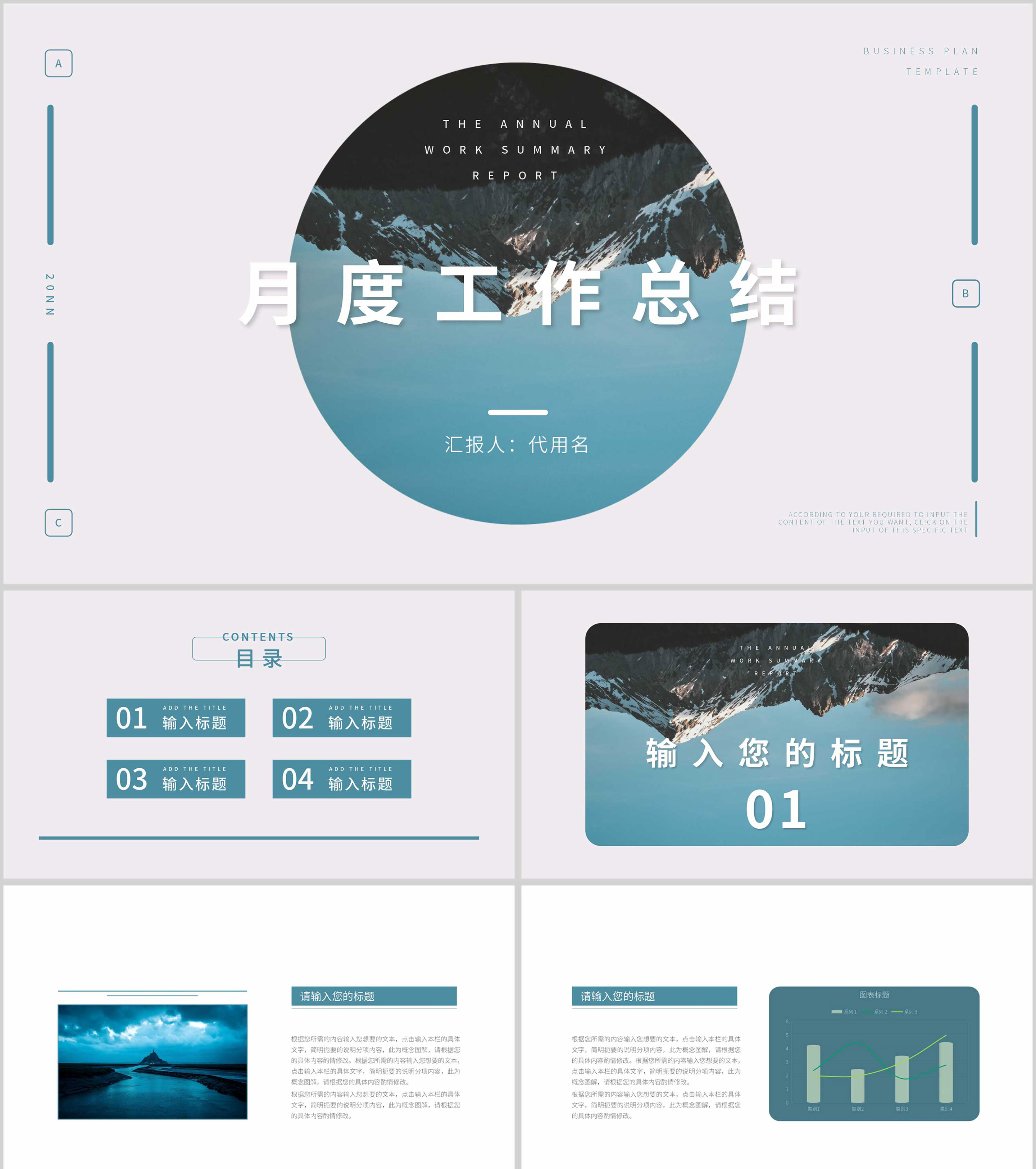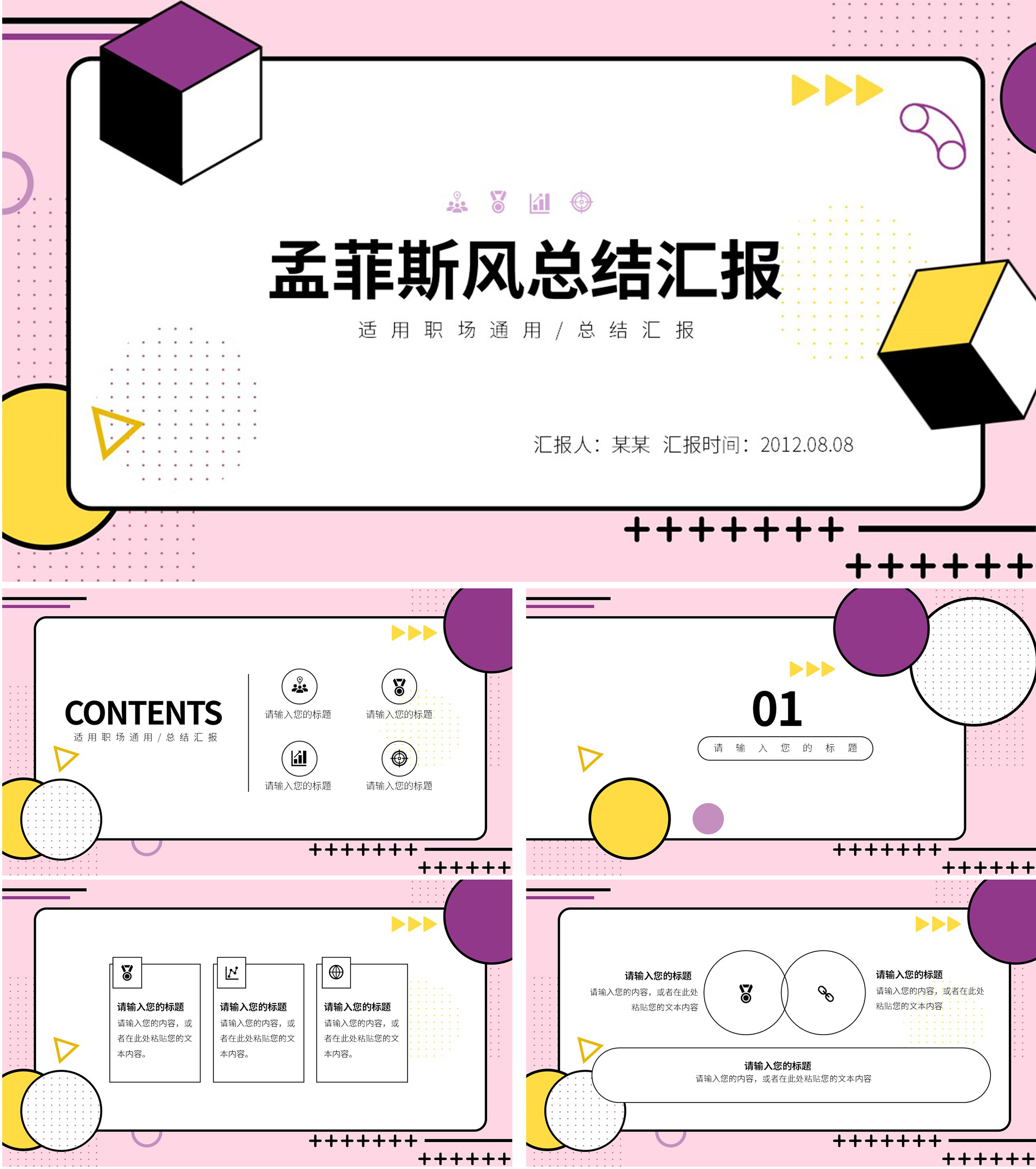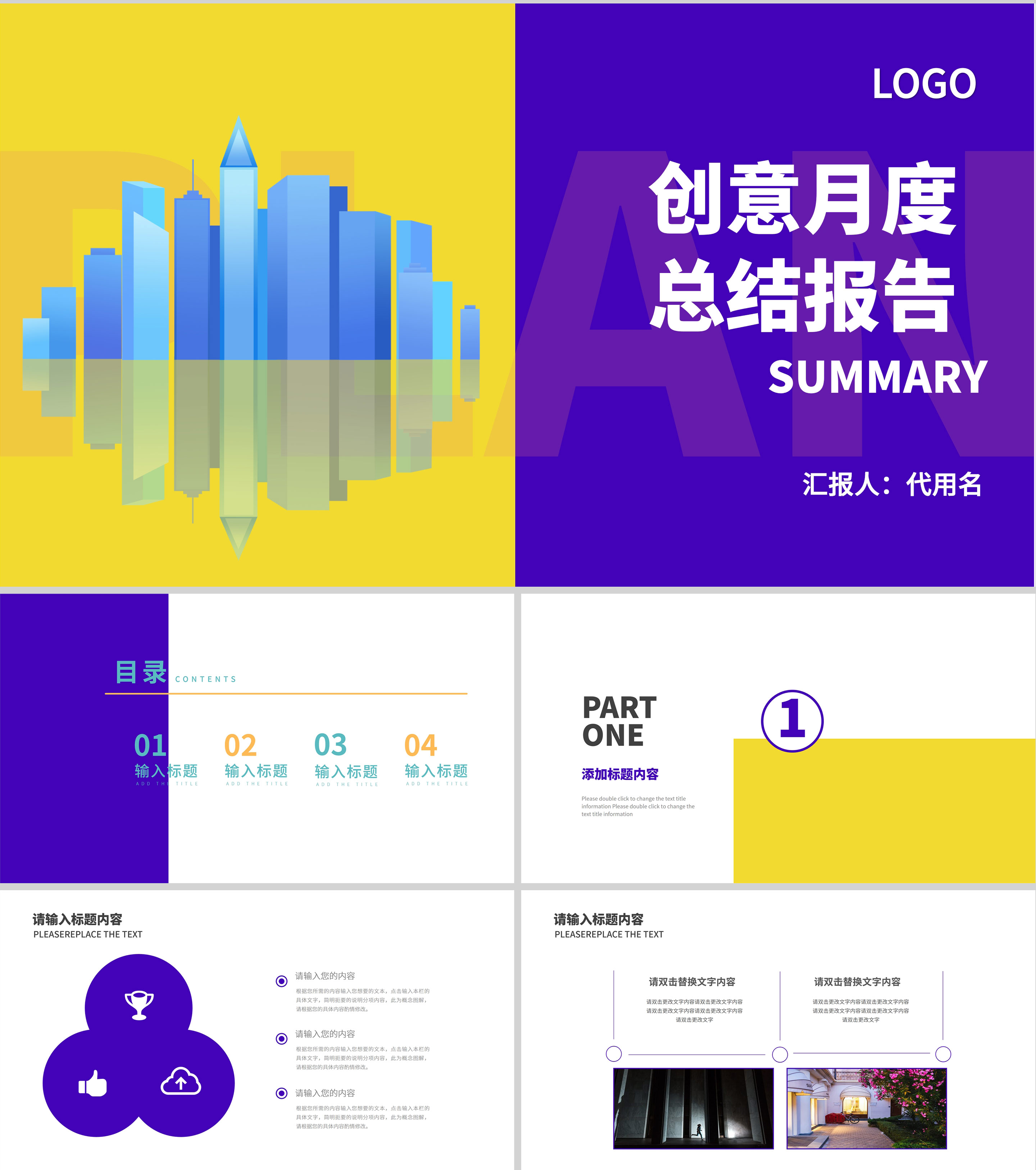 紫黄拼色几何风都市月度总结汇报PPT模板