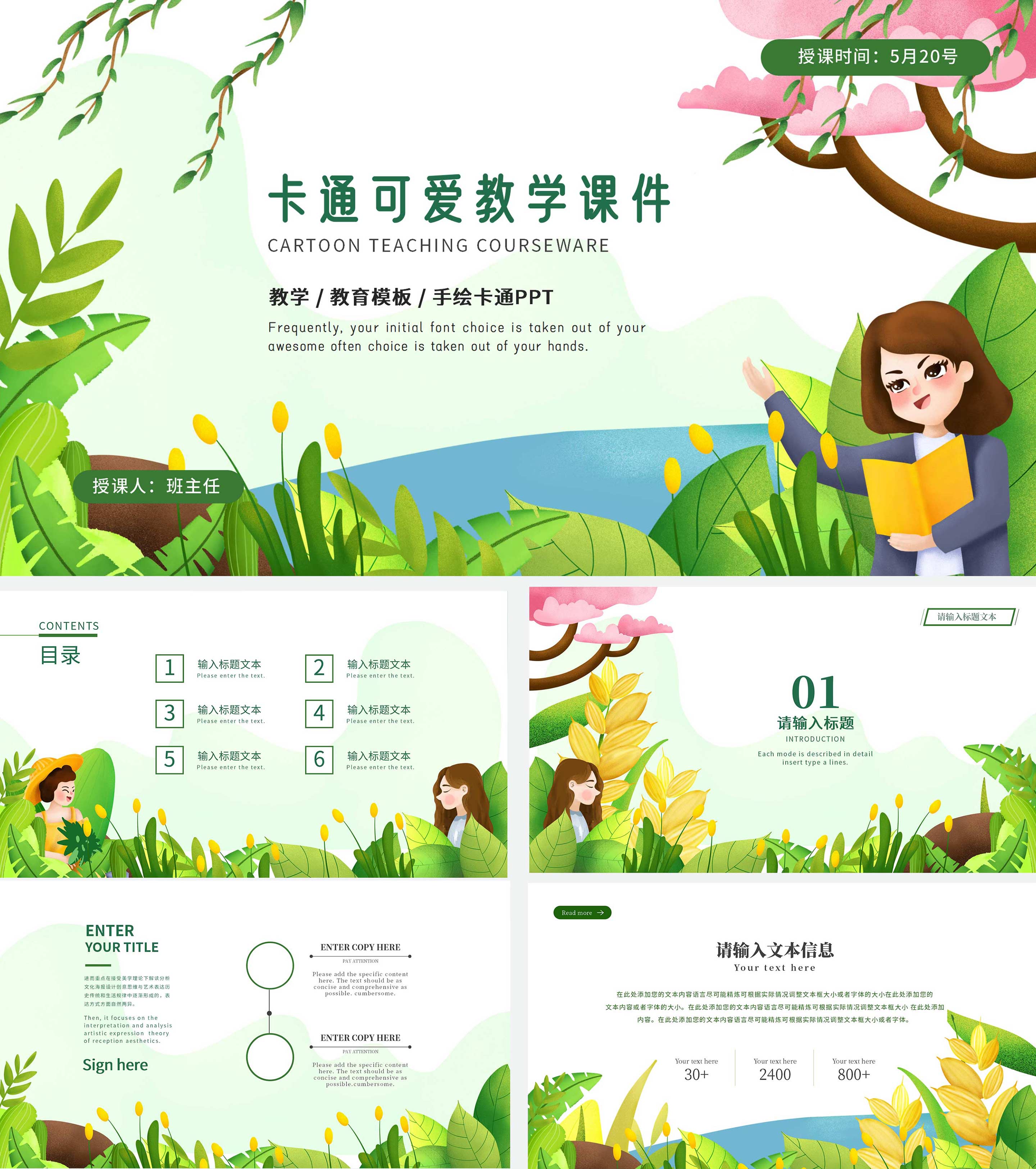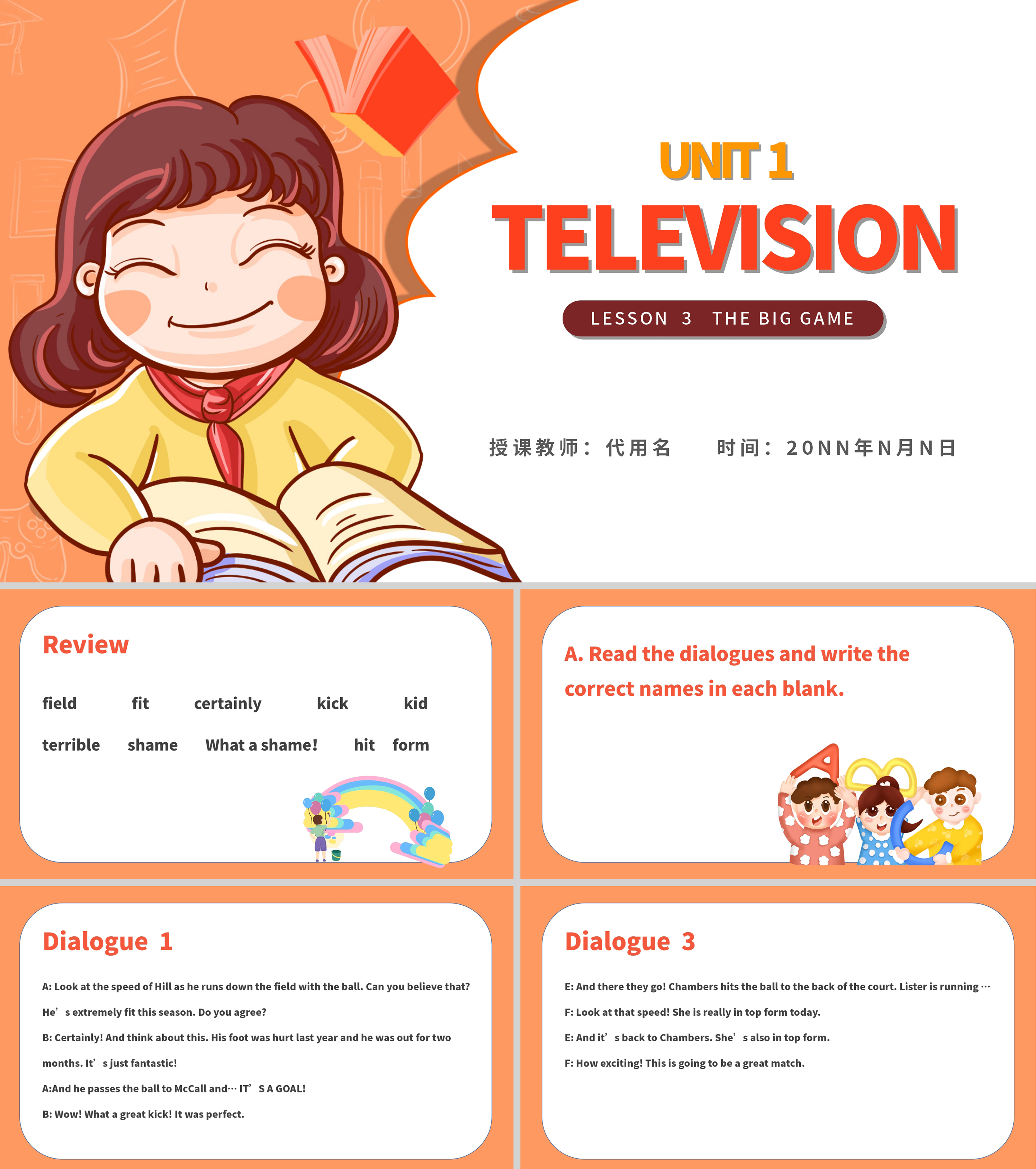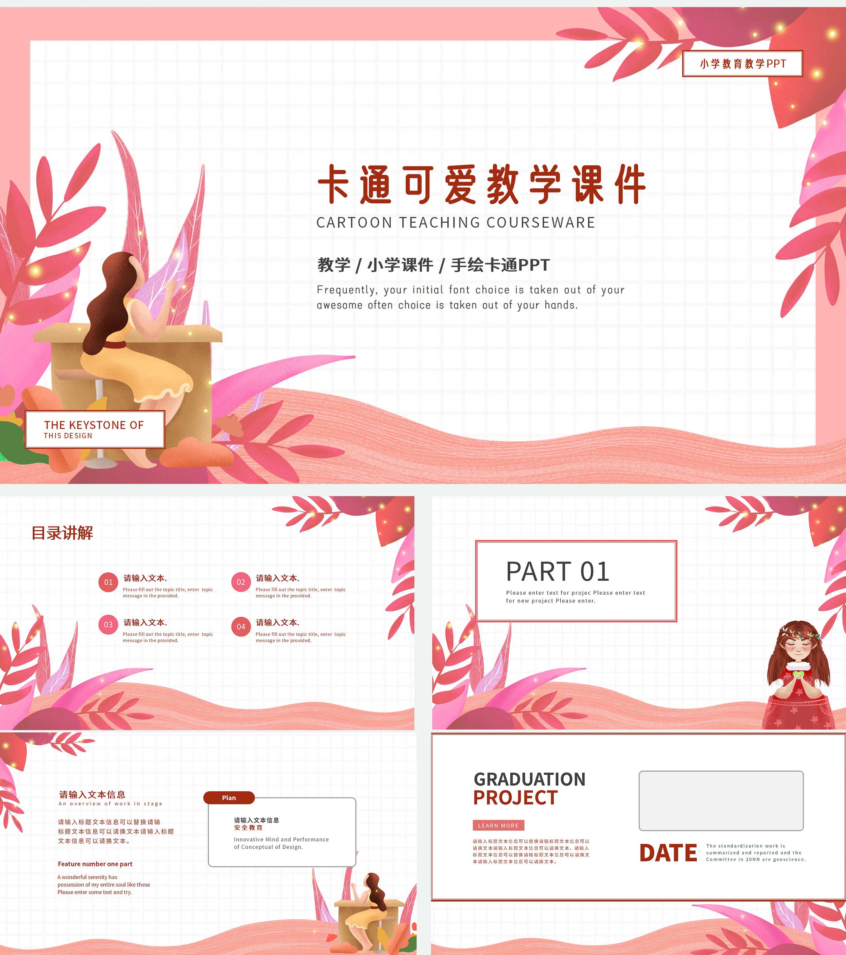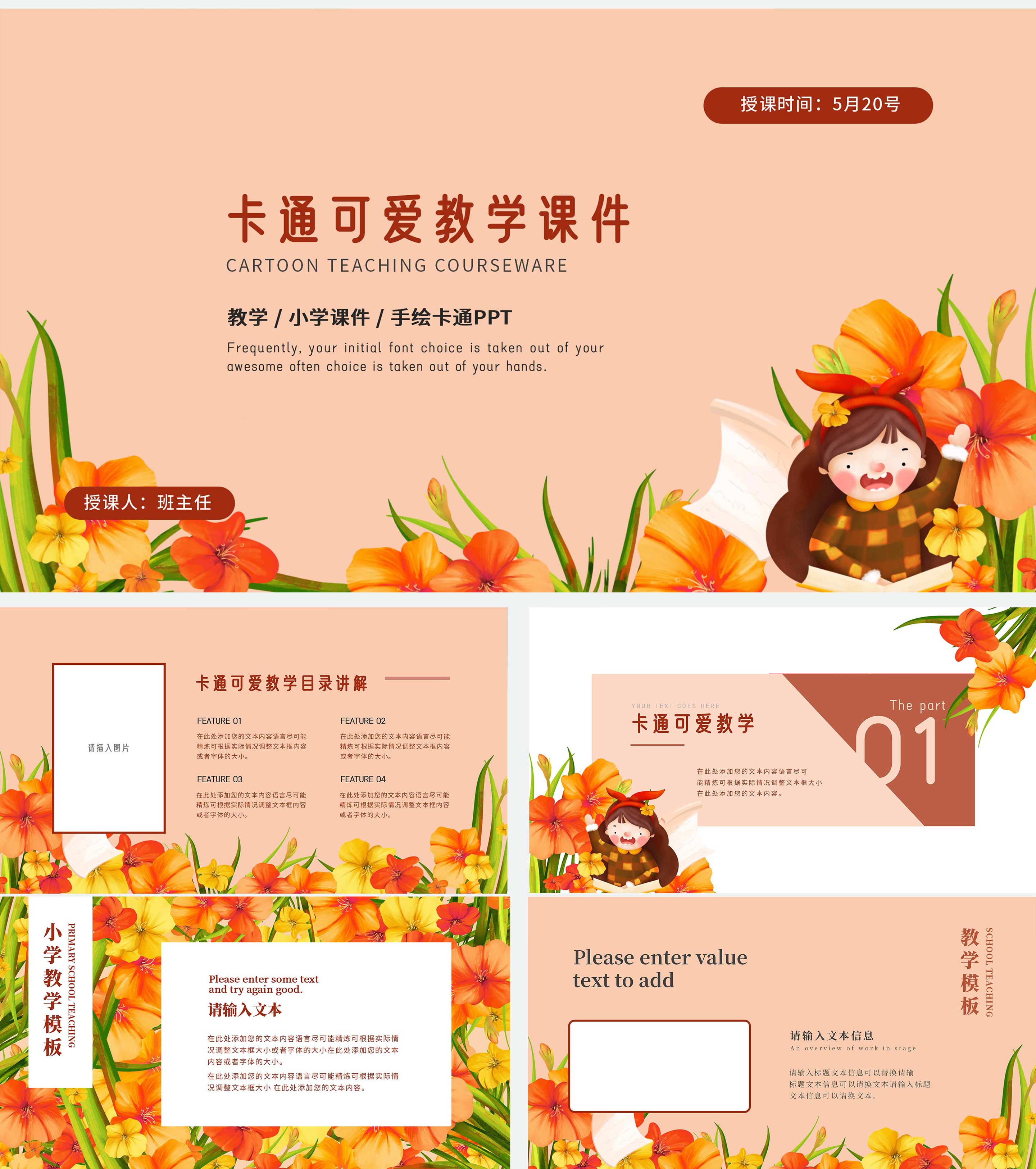 橘粉色卡通可爱小女孩教学课件PPT模板