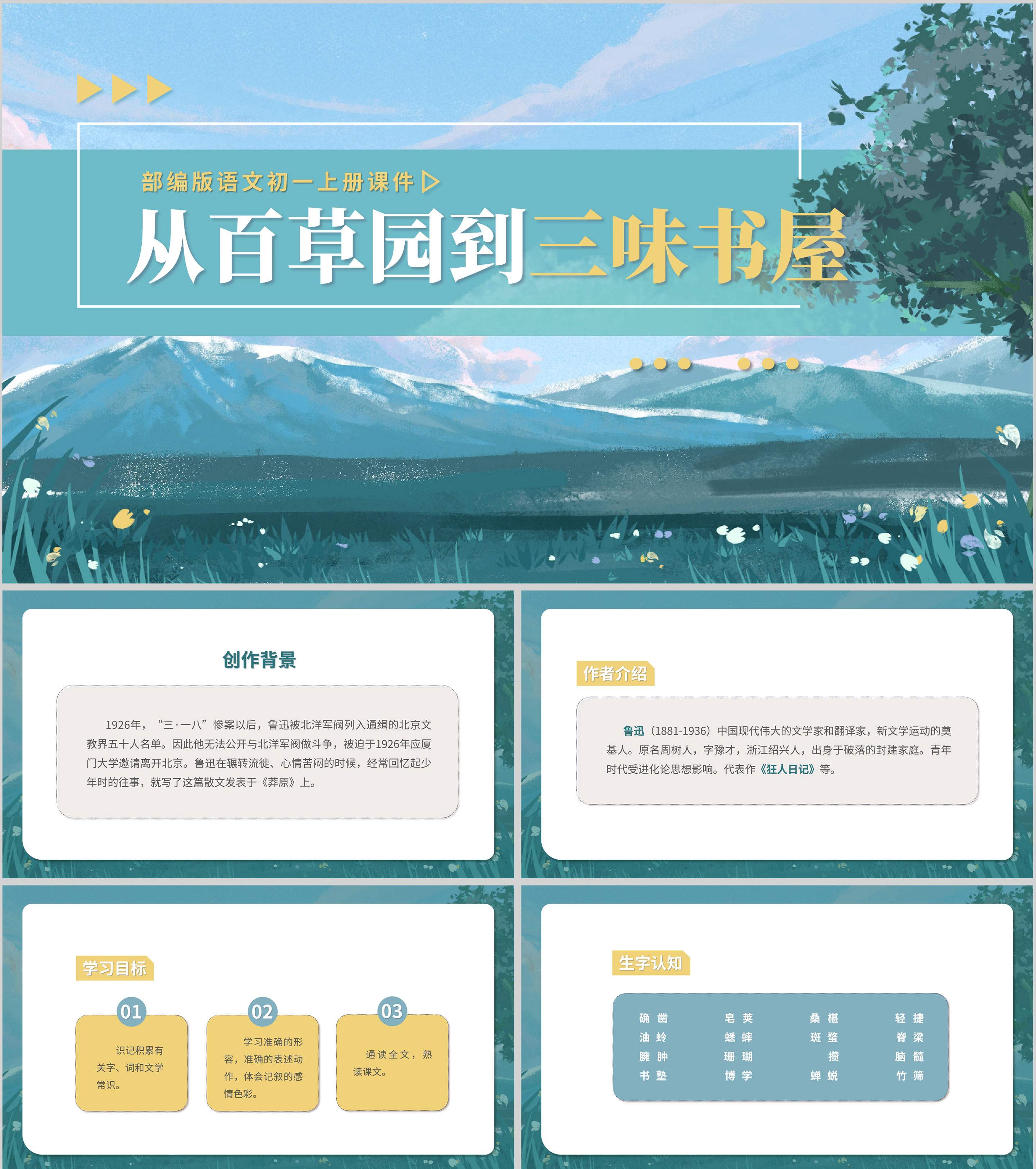 蓝色水彩风语文初一从百草园到三味书屋PPT课件