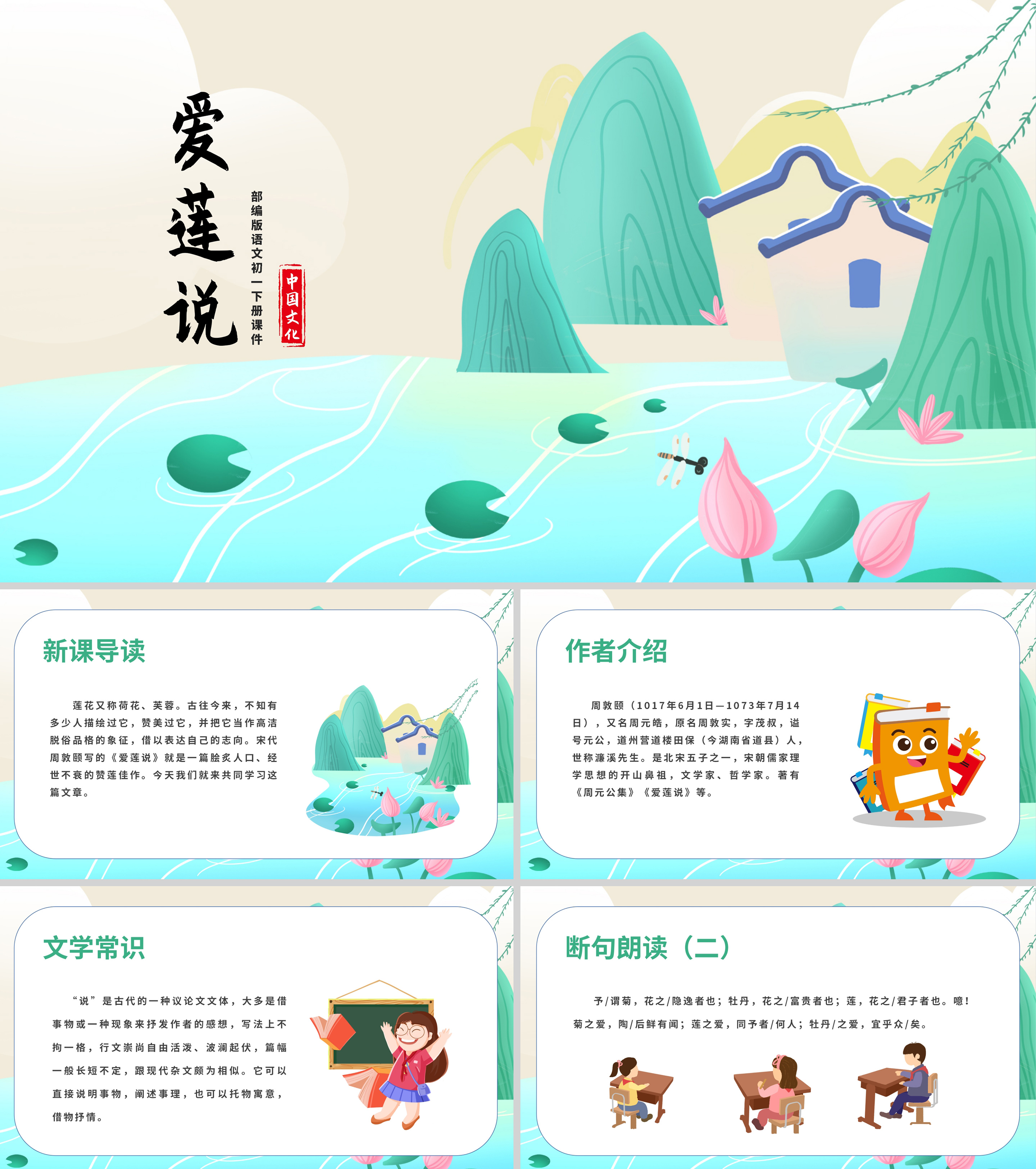 蓝色水彩风初一语文课件爱莲说PPT模板