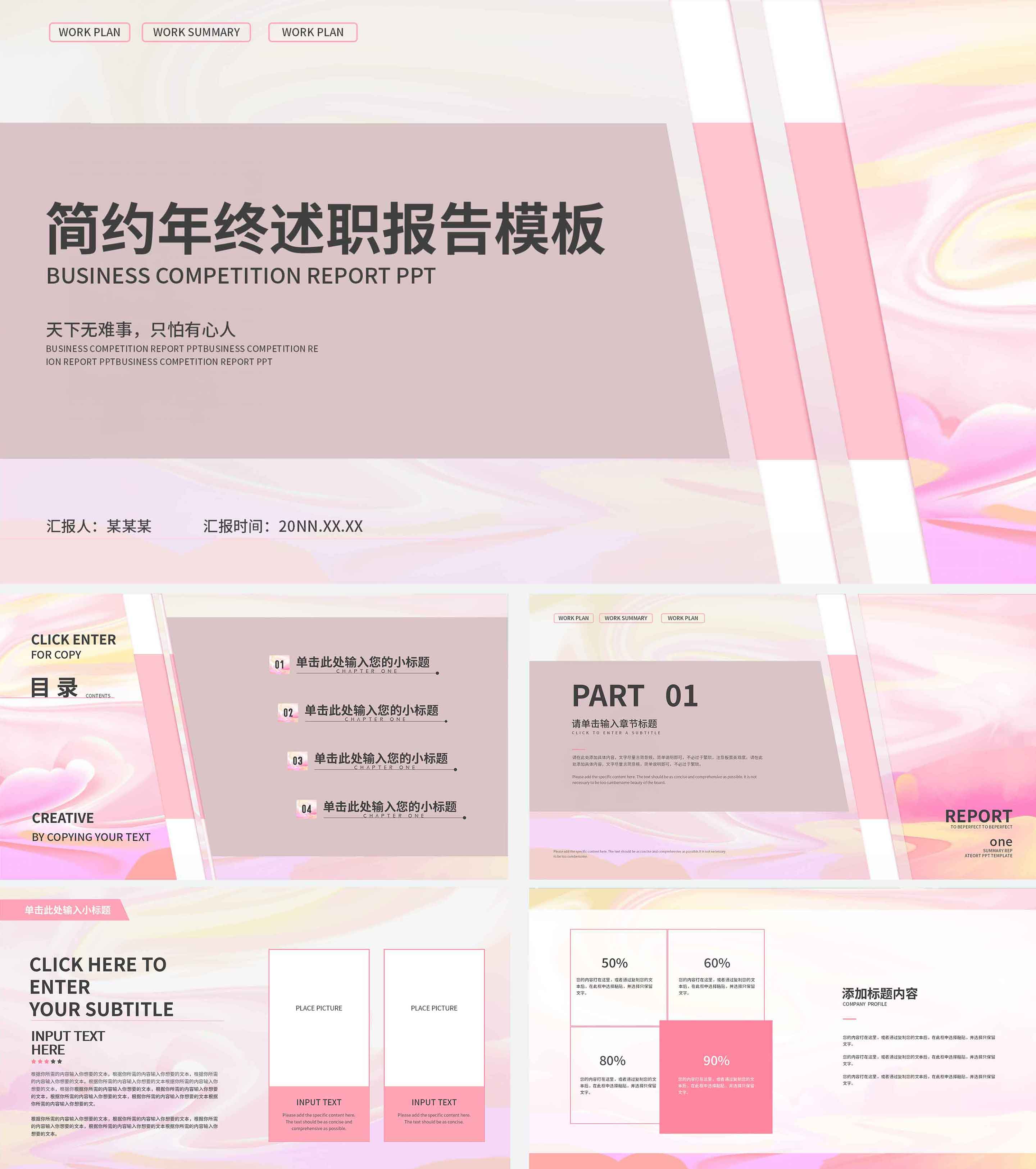 粉色大理石可爱年终述职PPT模板
