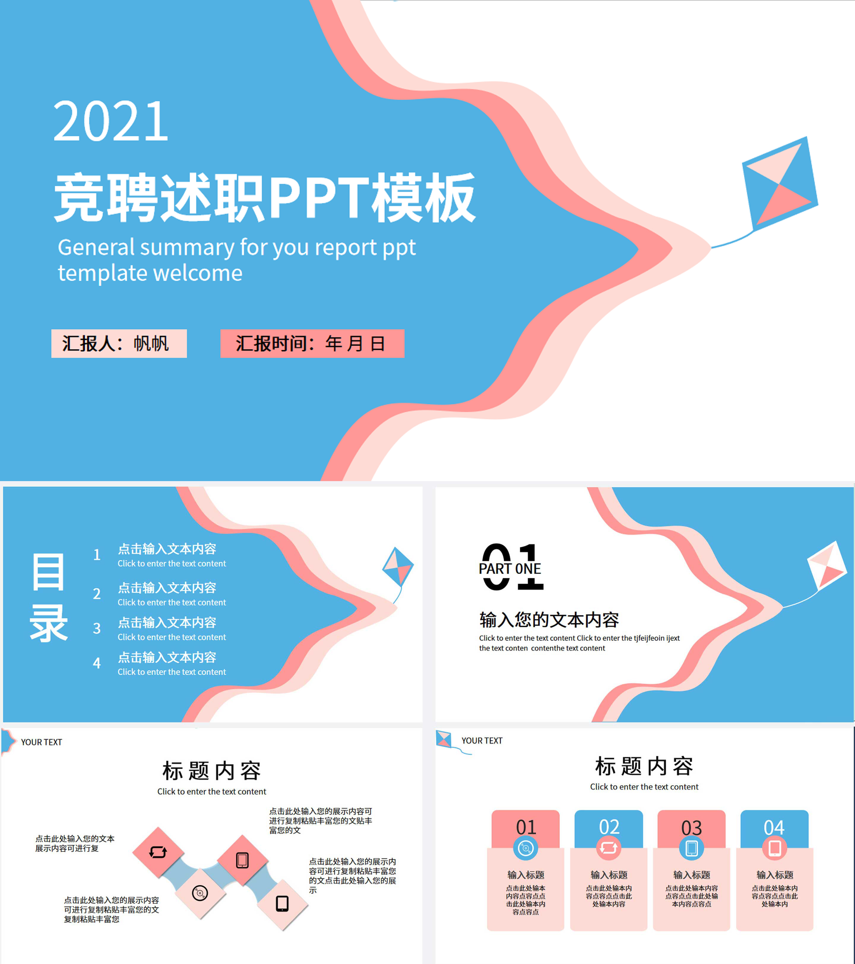 蓝色风筝云朵卡通竞聘述职PPT模板