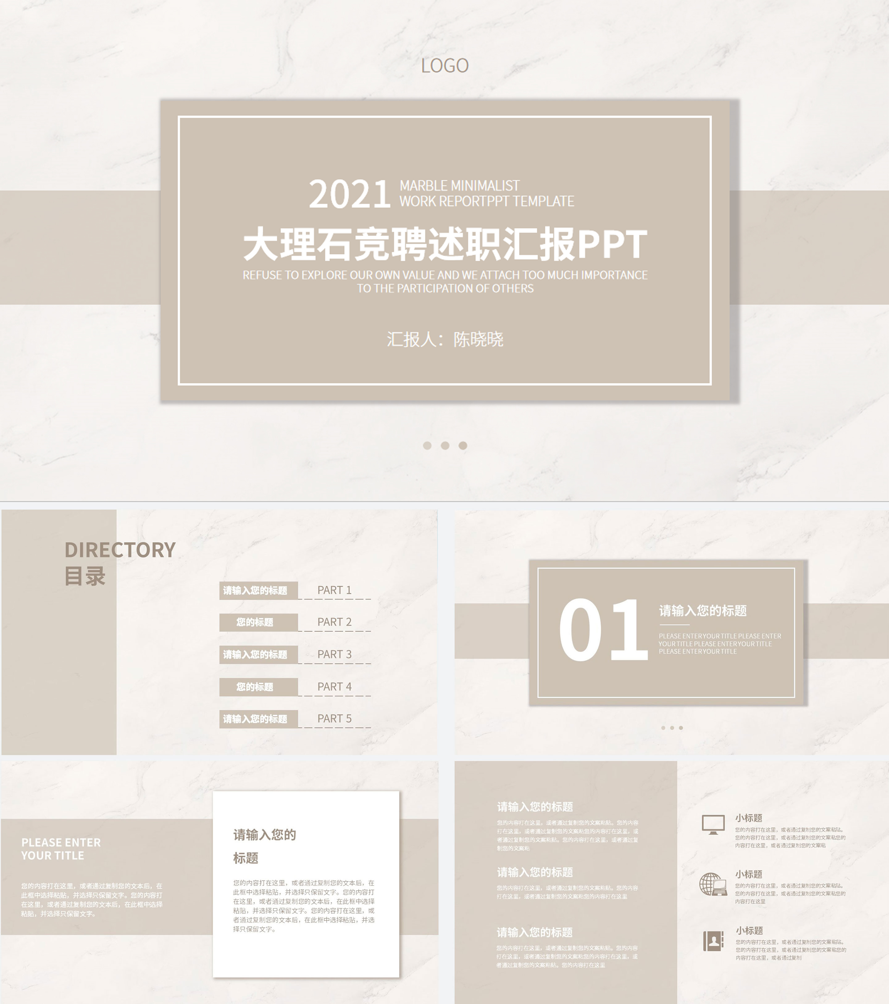 浅棕色大理石简约竞聘述职PPT模板