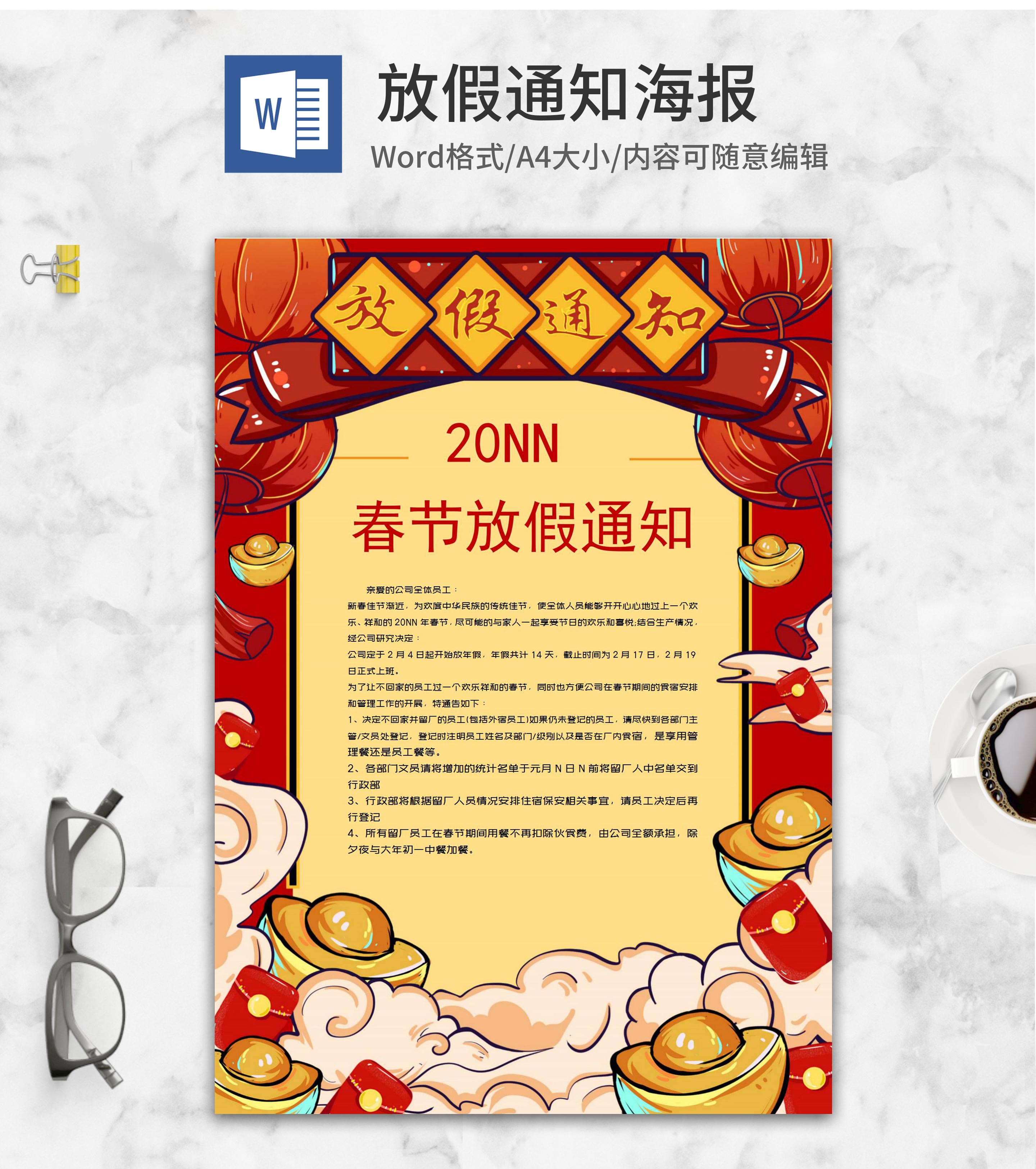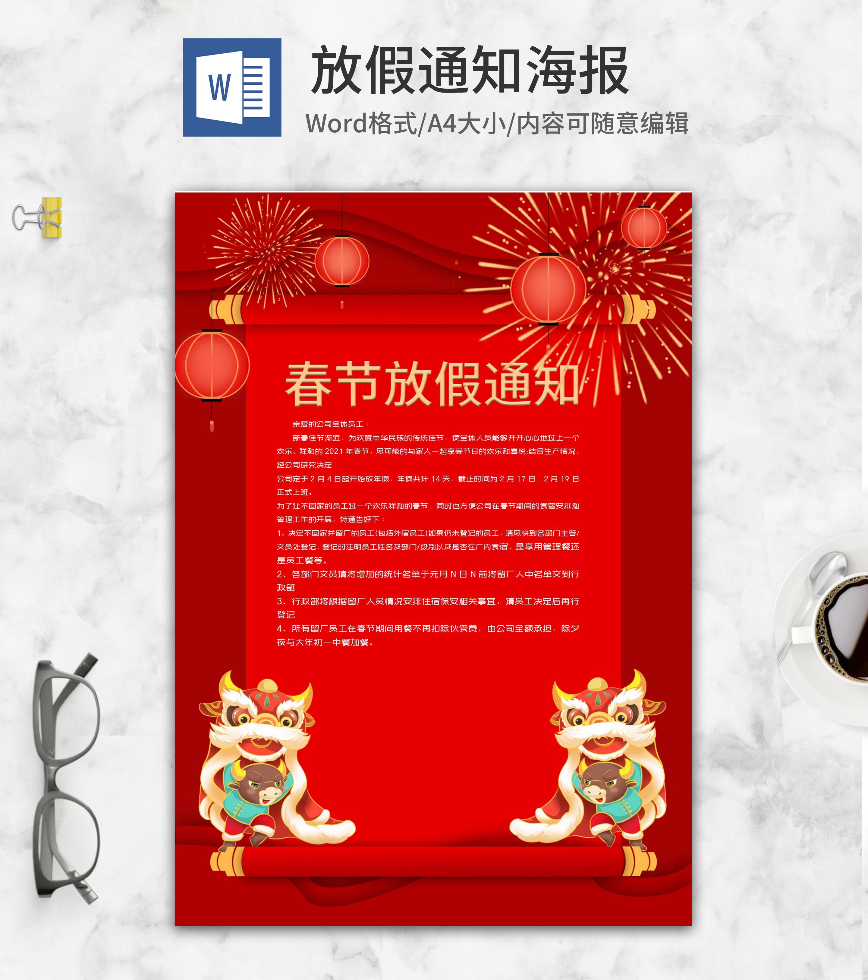 小清新红色春节放假通知word模板