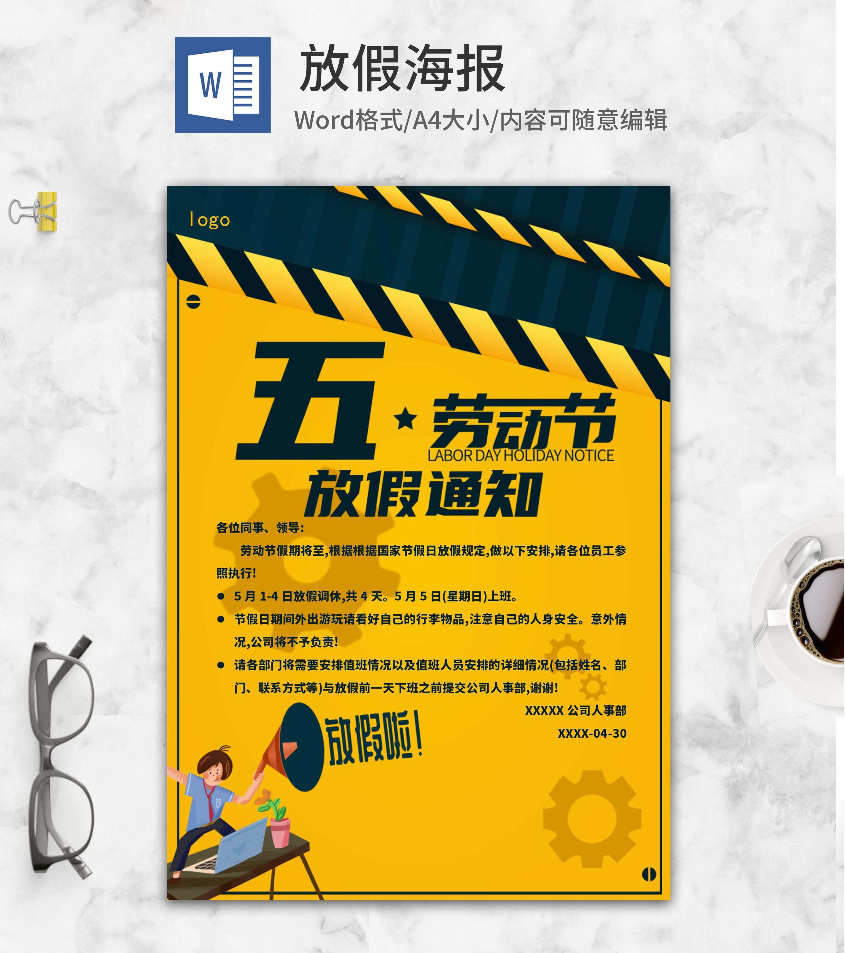 小清新黄色劳动节海报word模板