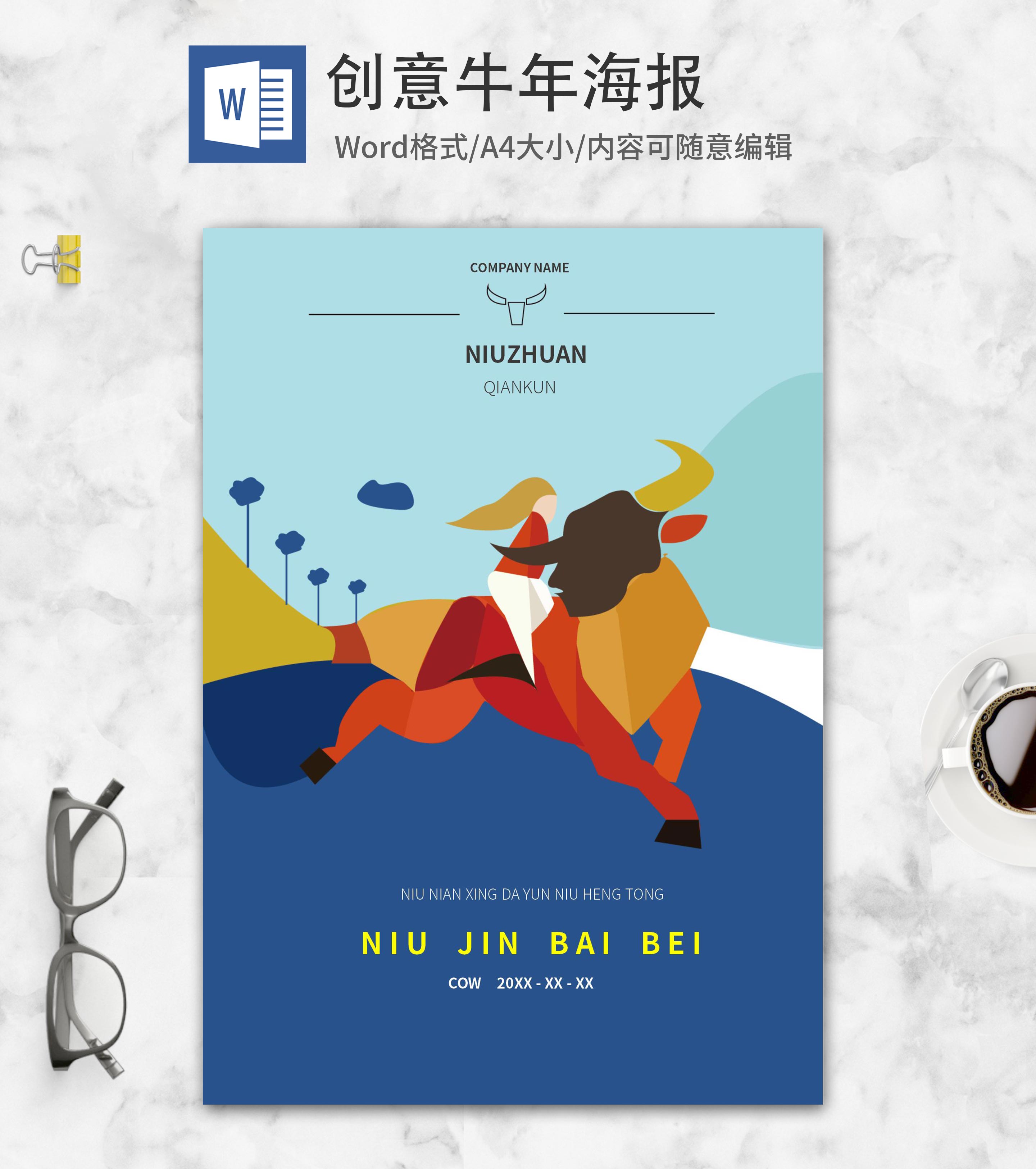蓝色简约创意牛年海报word模板