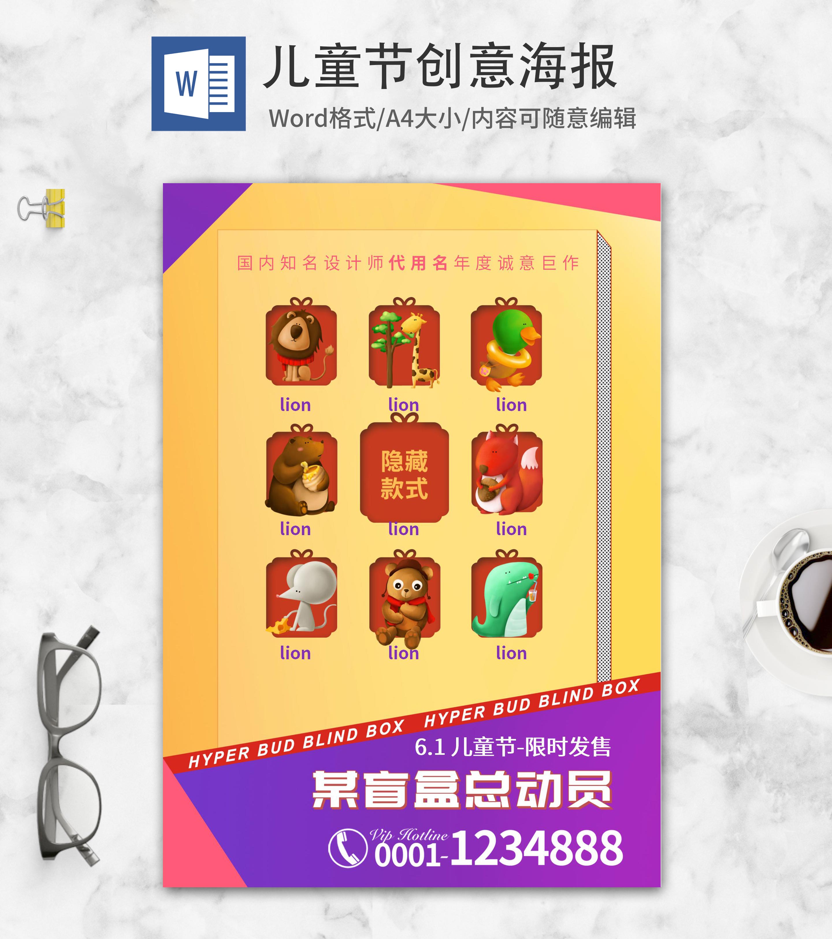 可爱儿童节动物盲盒海报word模板