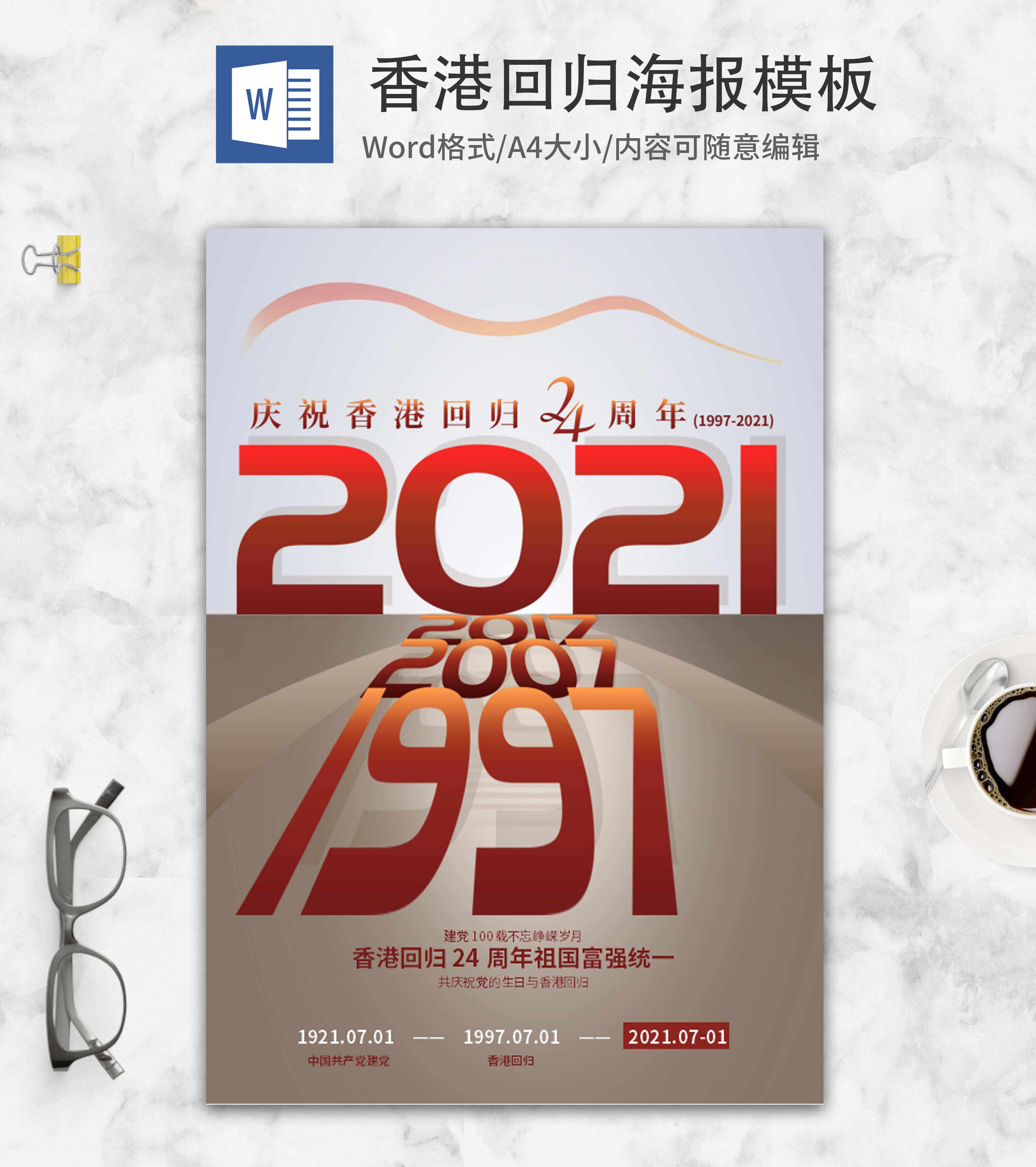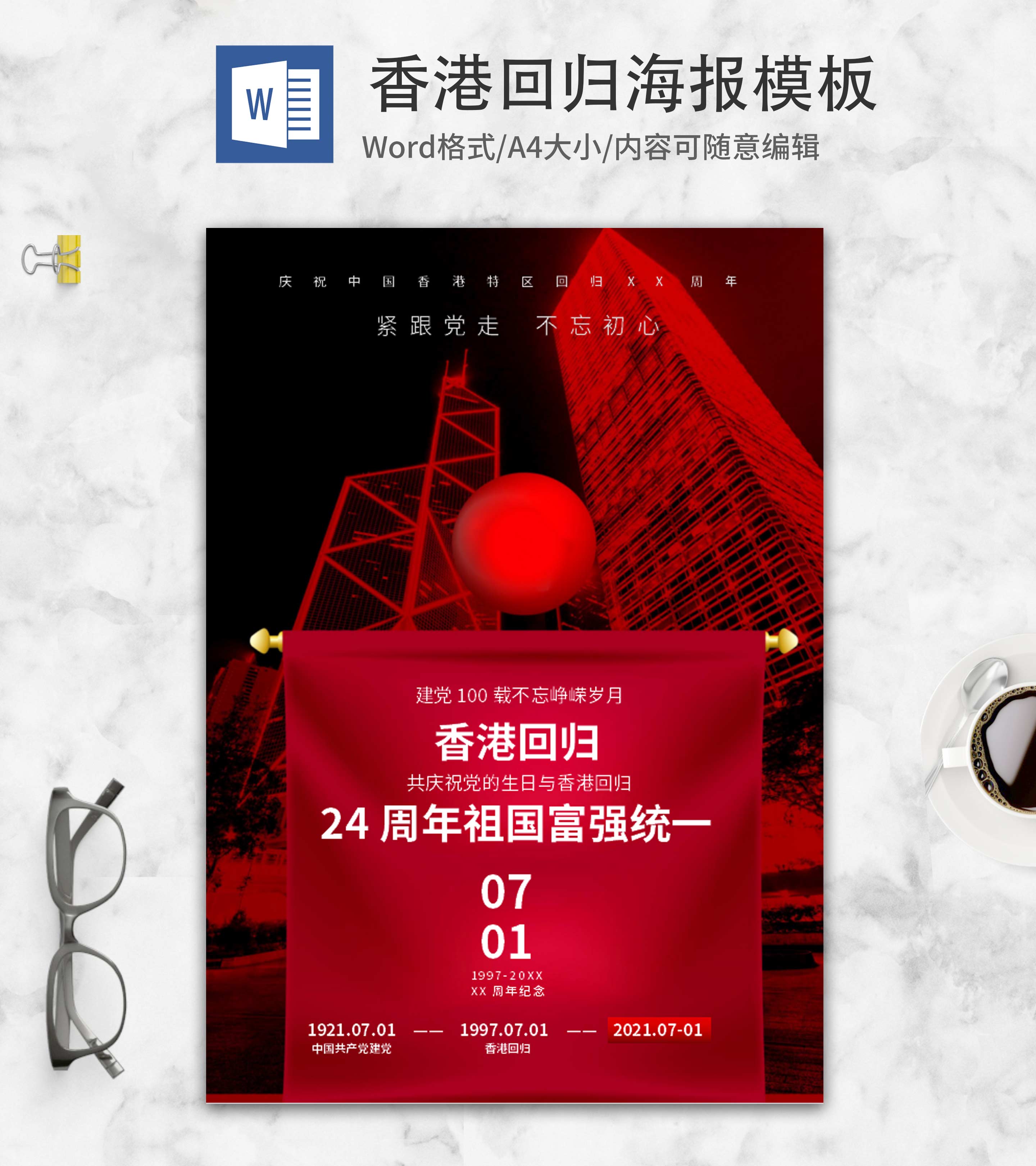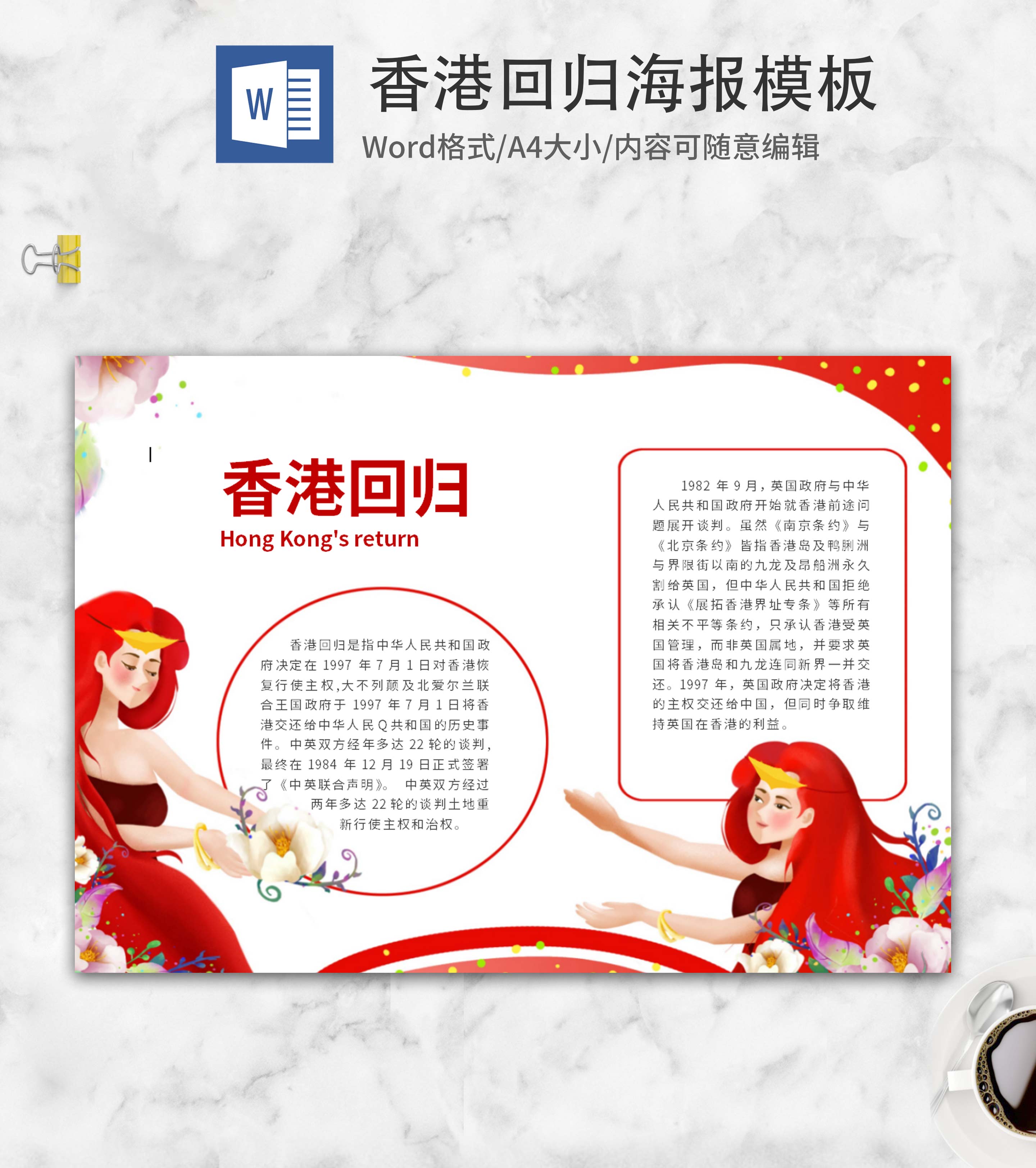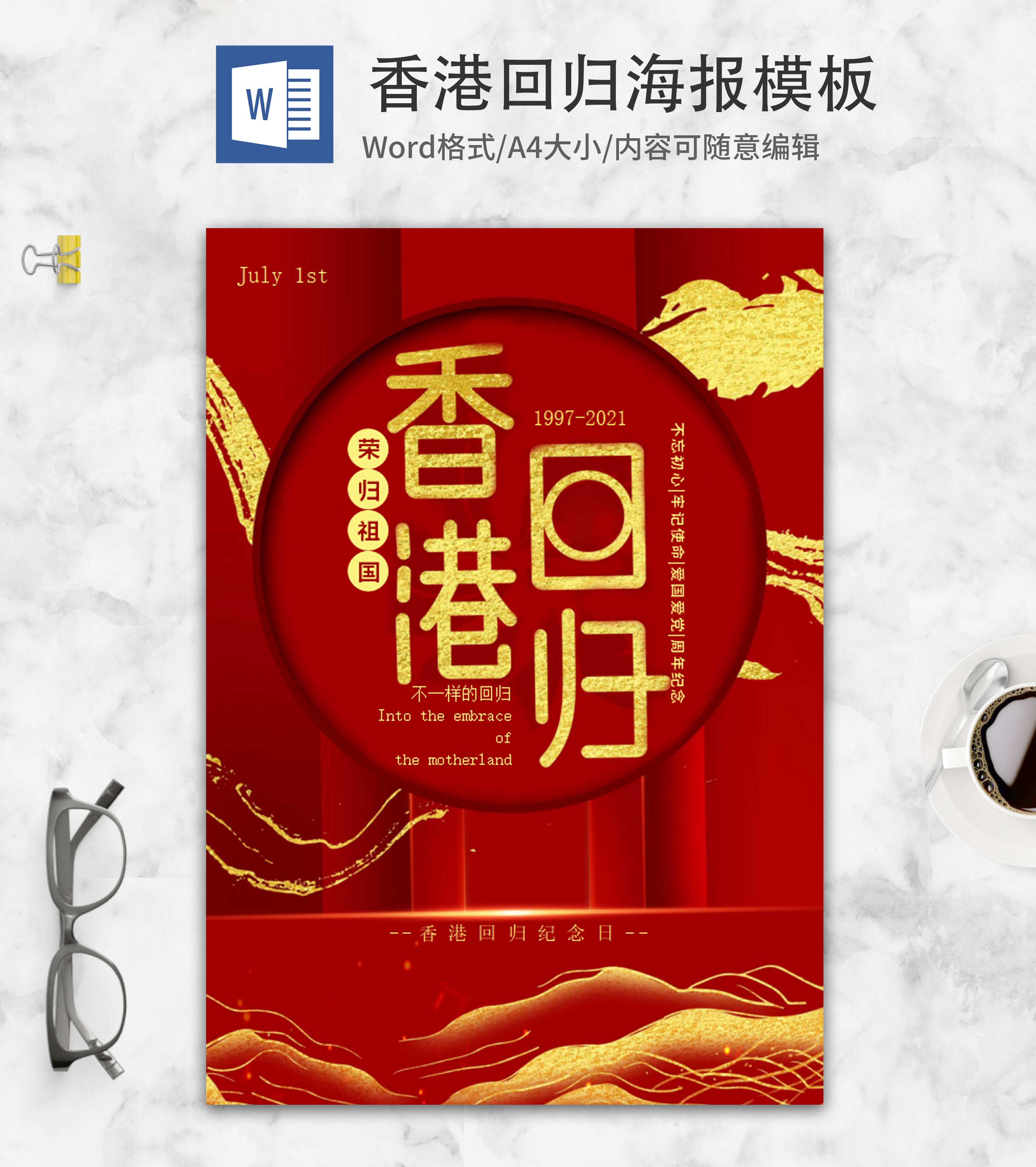 红色简约香港回归周年word模板