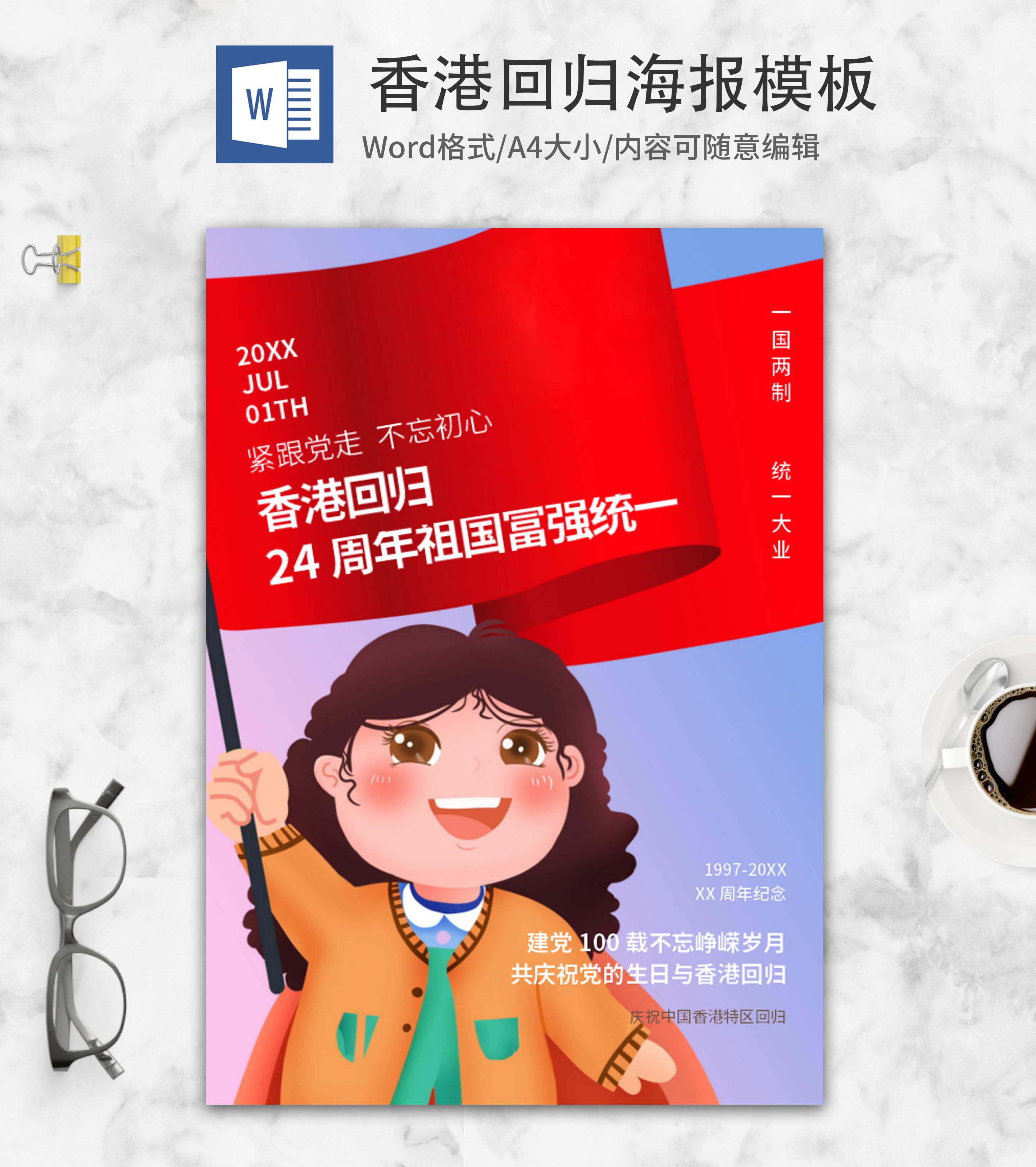 蓝色卡通香港回归纪念日word模板