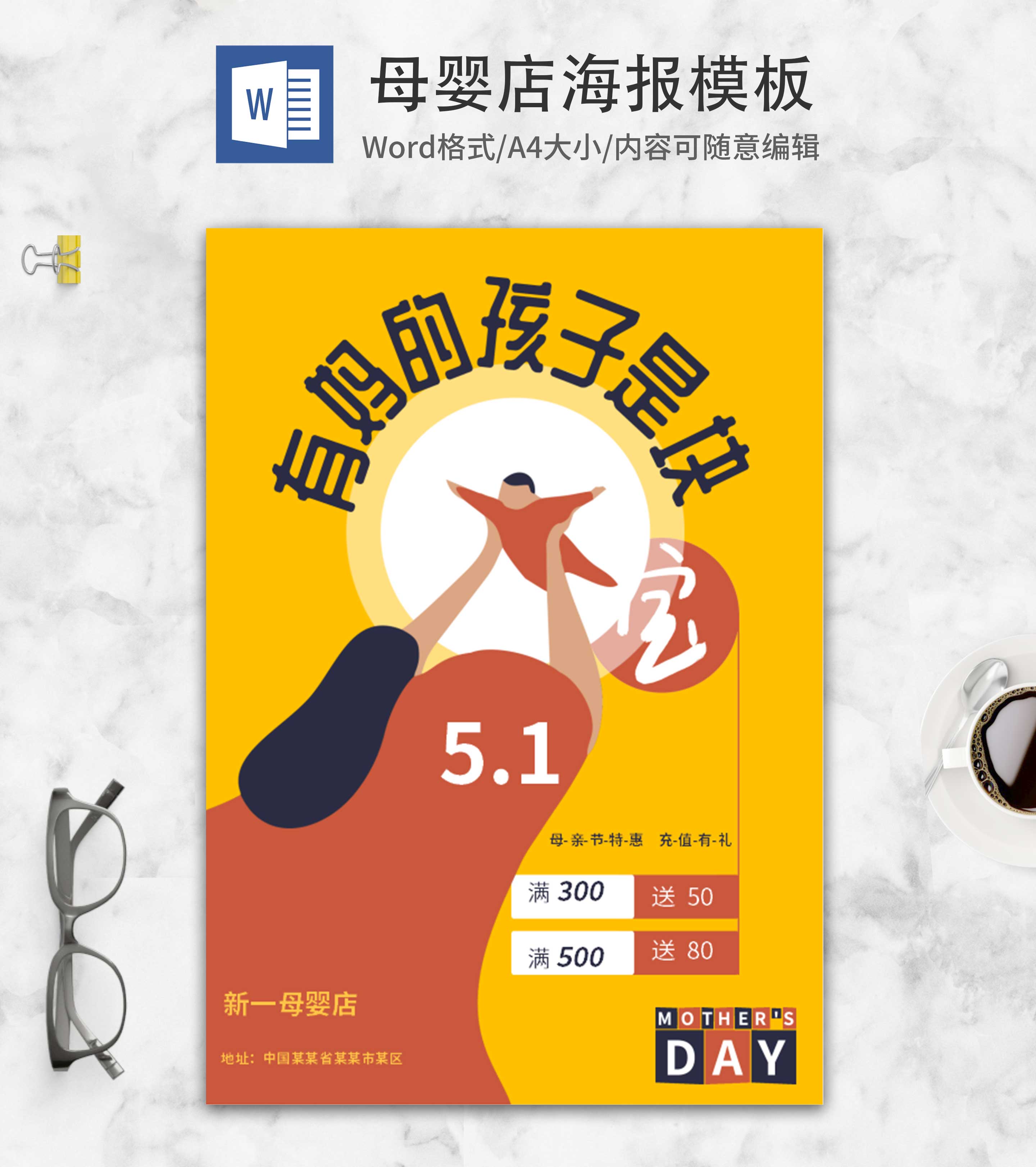 黄色可爱卡通母亲节海报word模板