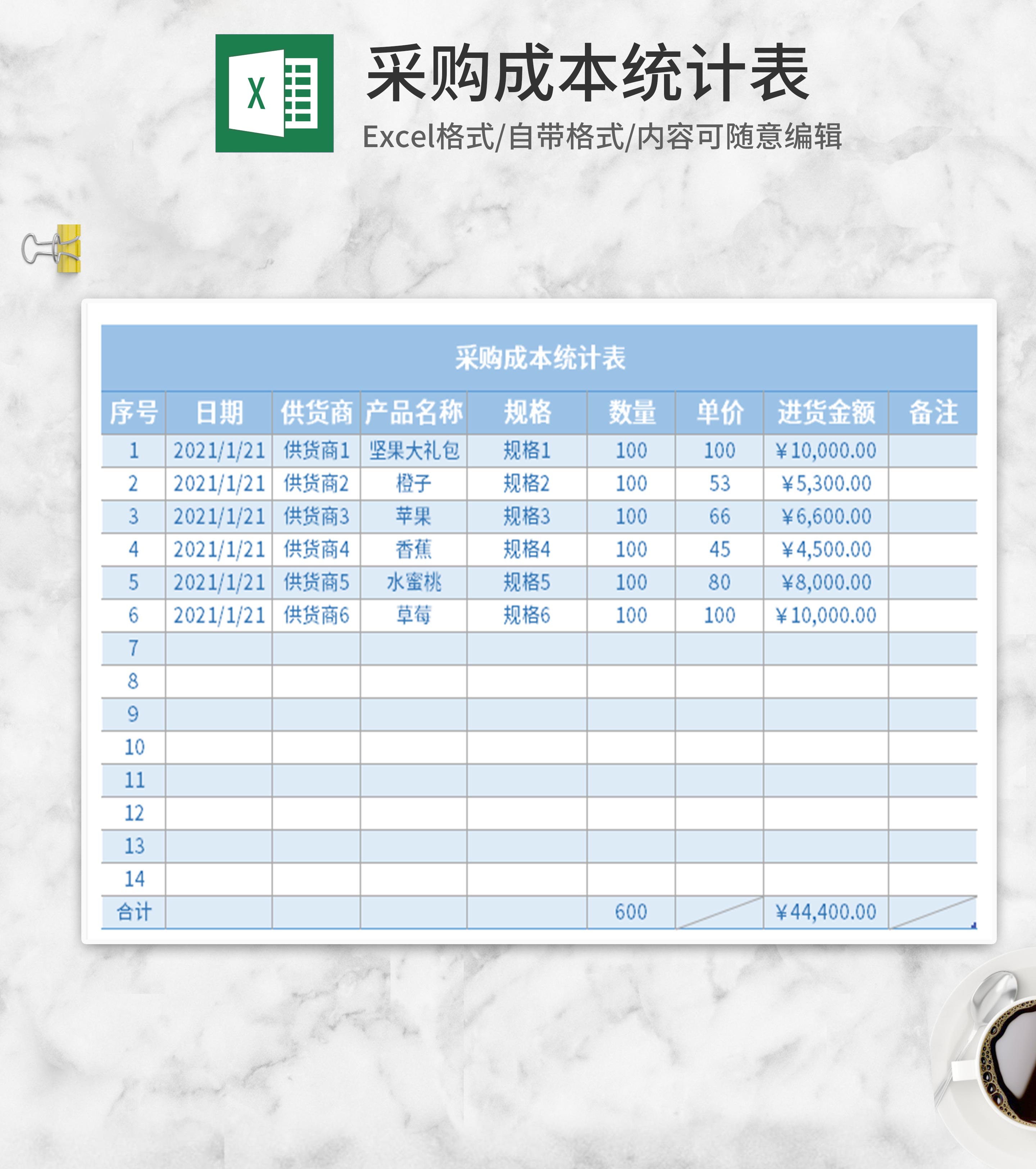 简约蓝色采购成本统计表Excel模板