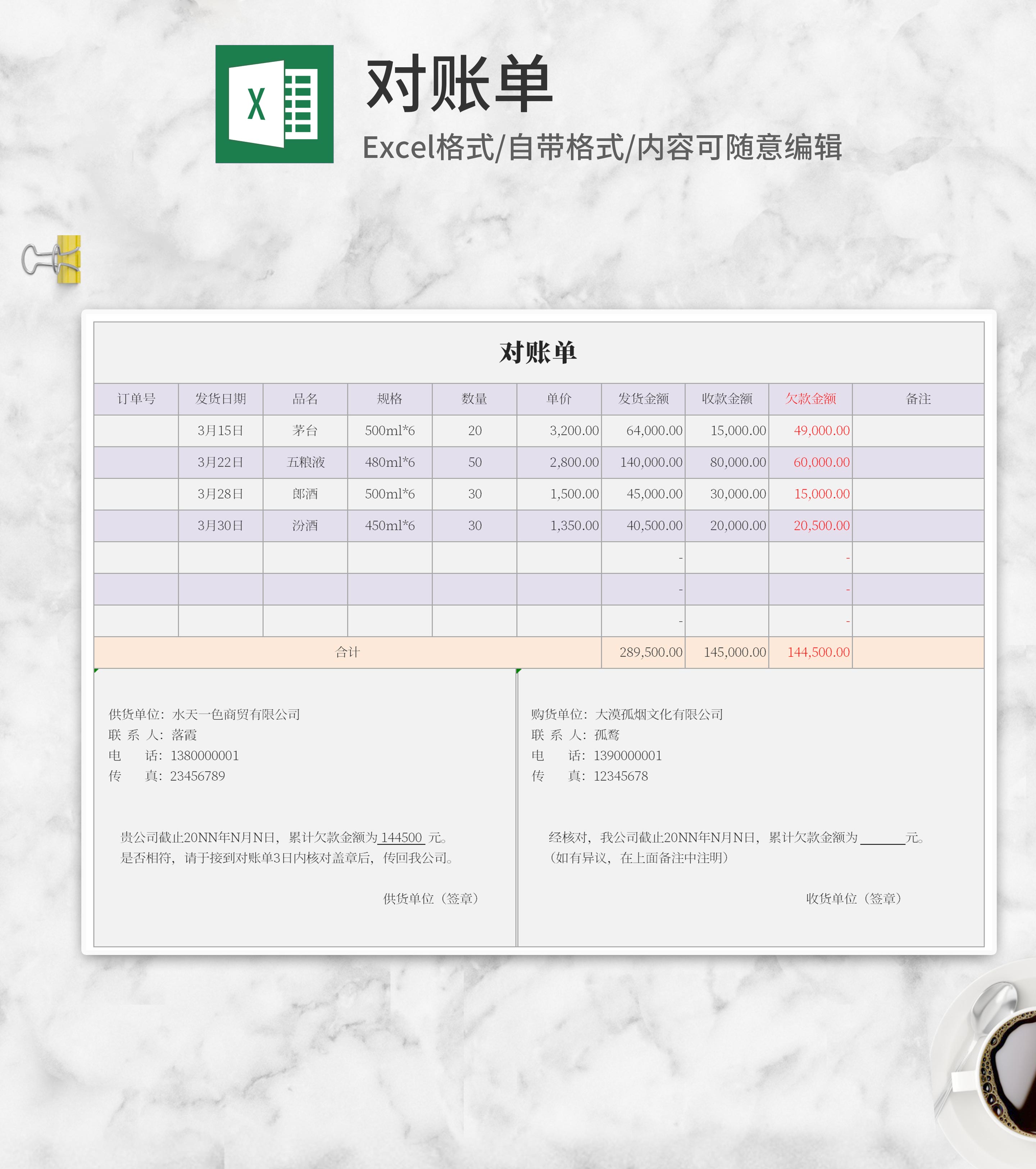 小清新对账单Excel模板