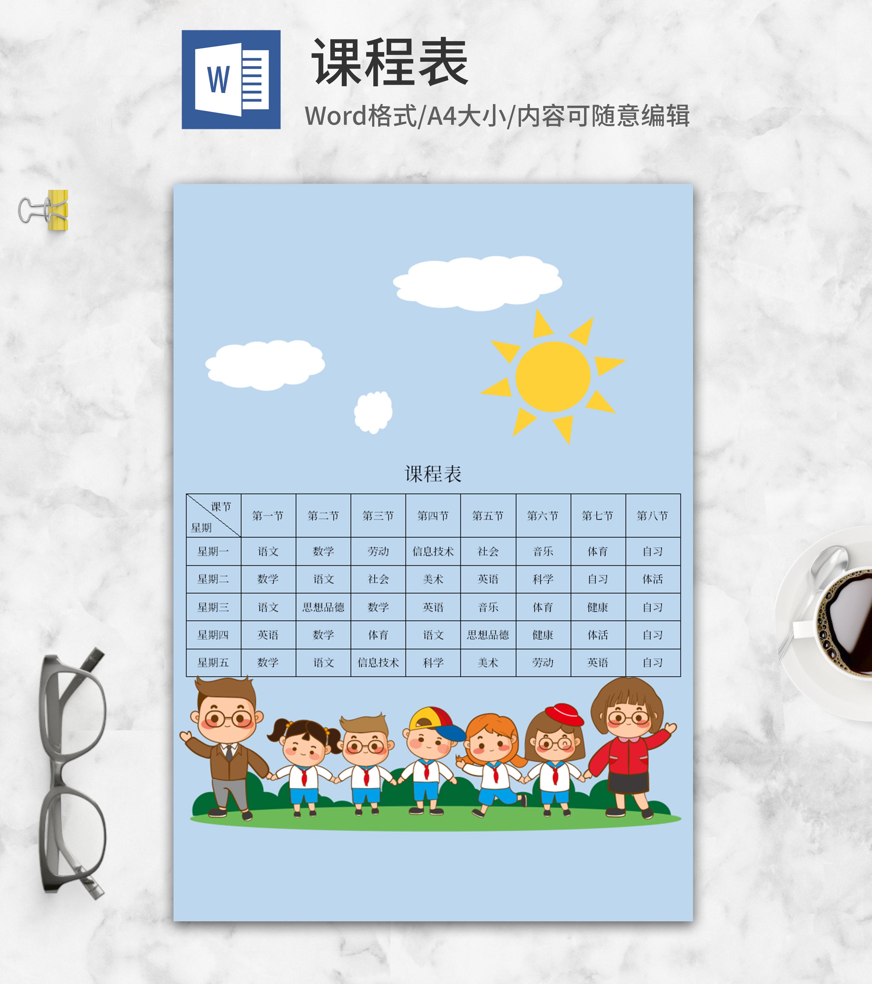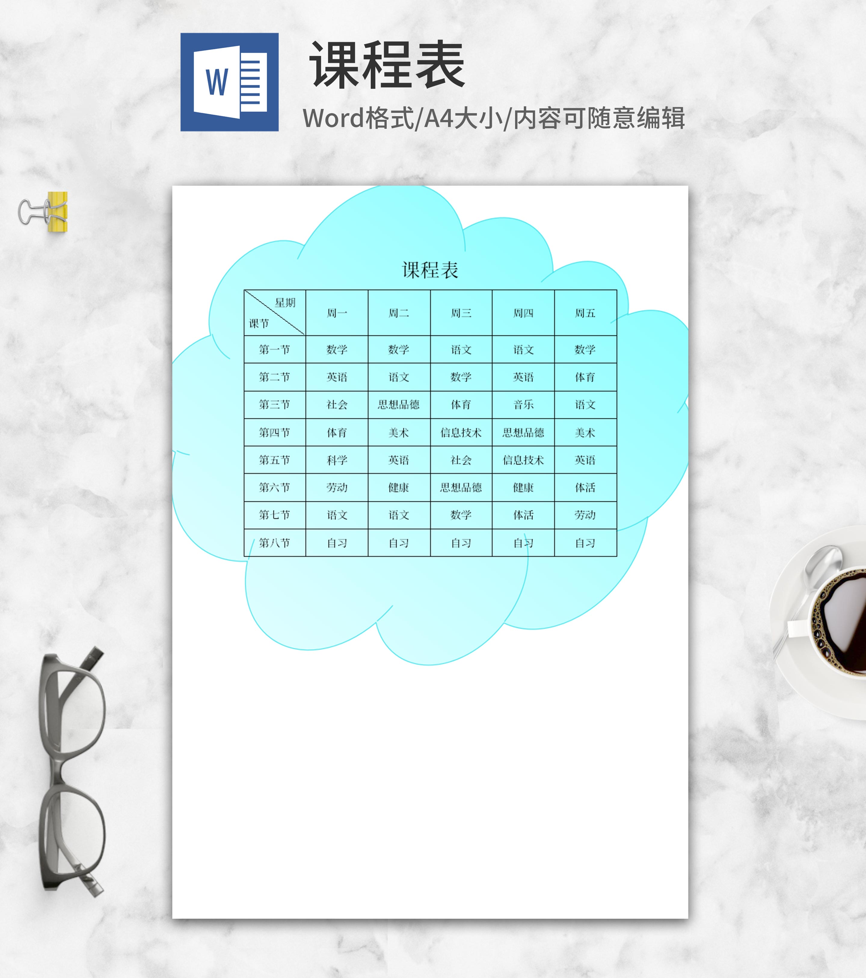 蓝色云朵班级课程表word模板