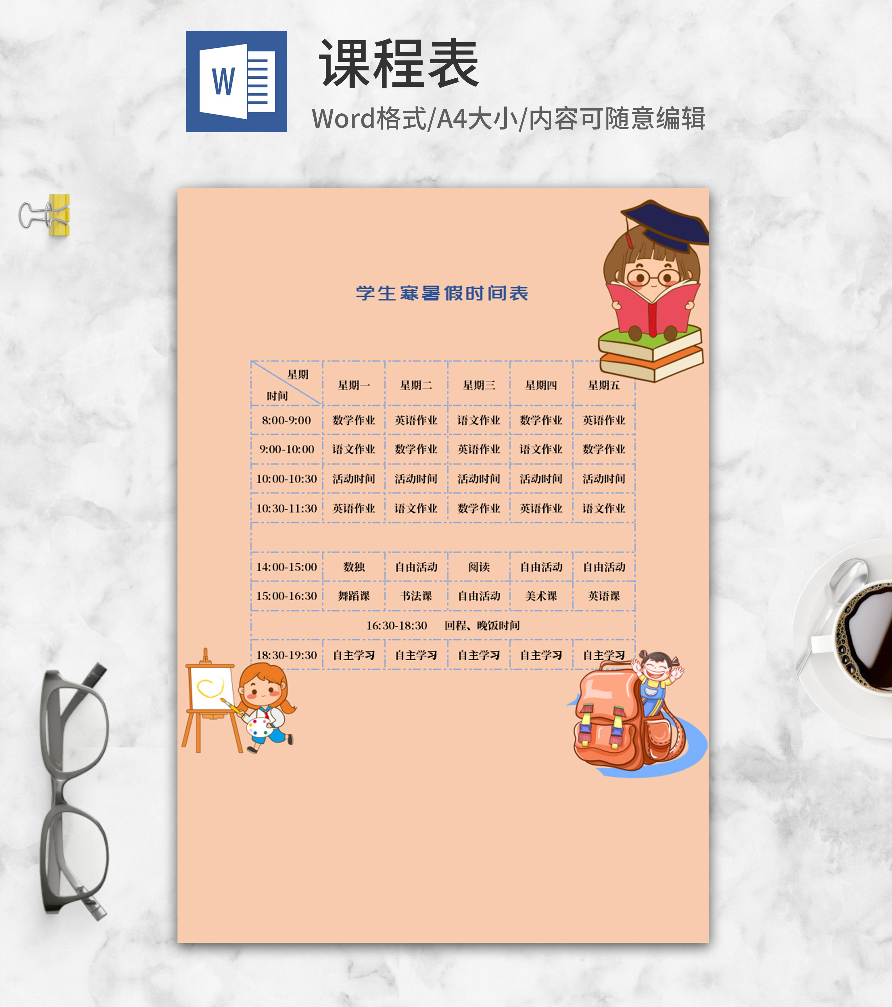 黄色学生寒暑假时间表word模板