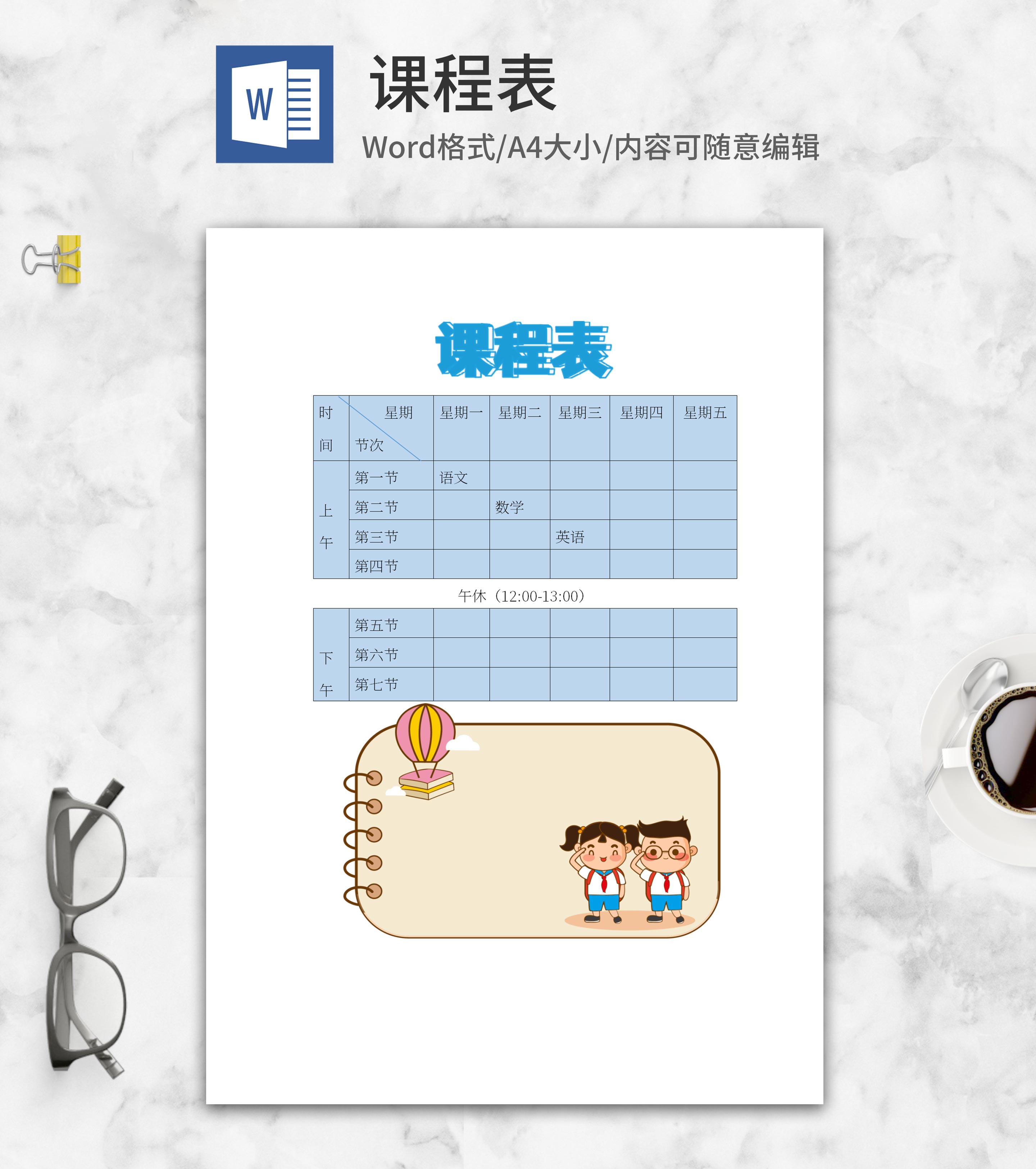 卡通学生记事本式课程表word模板