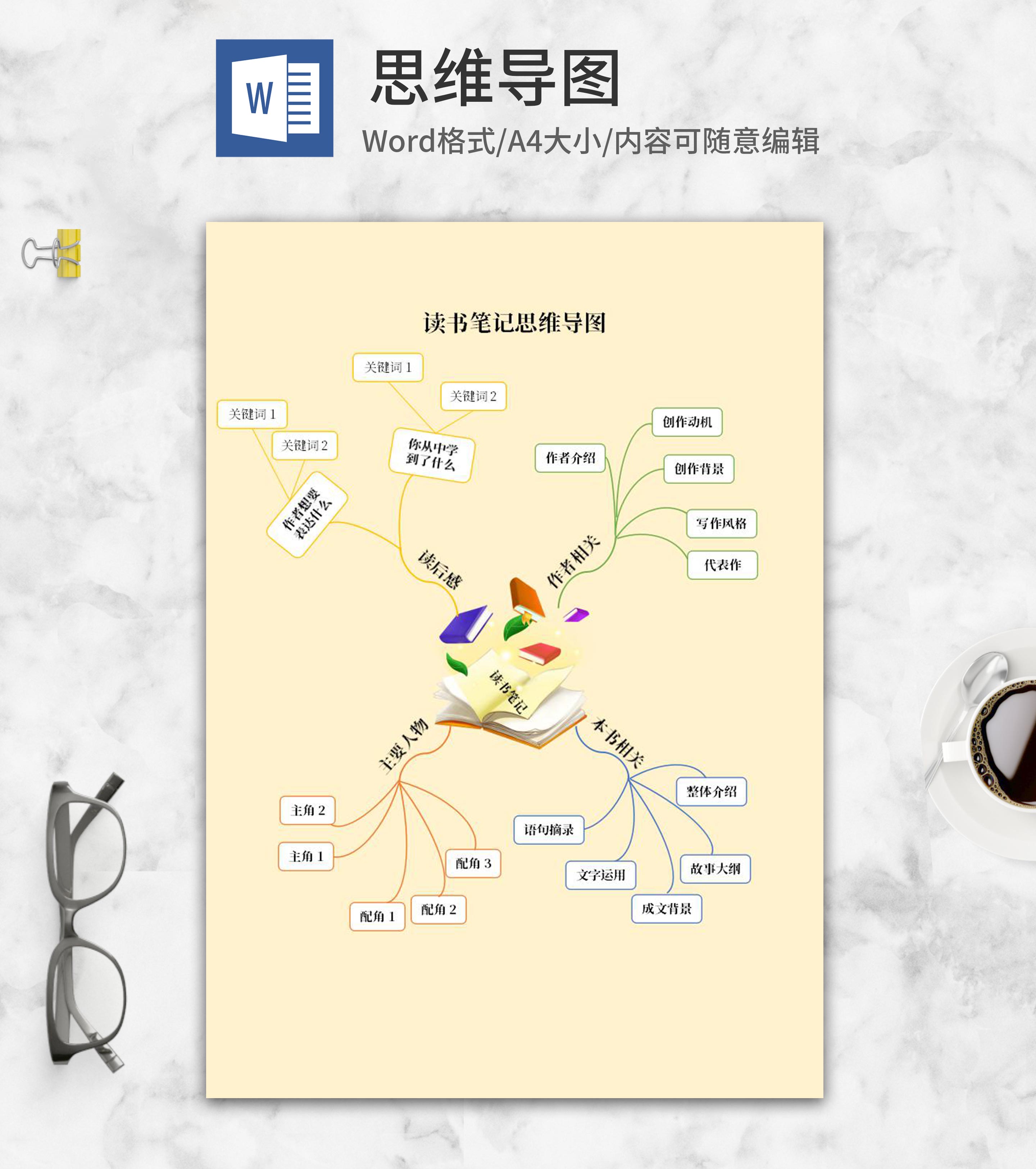 黄色读书笔记思维导图word模板