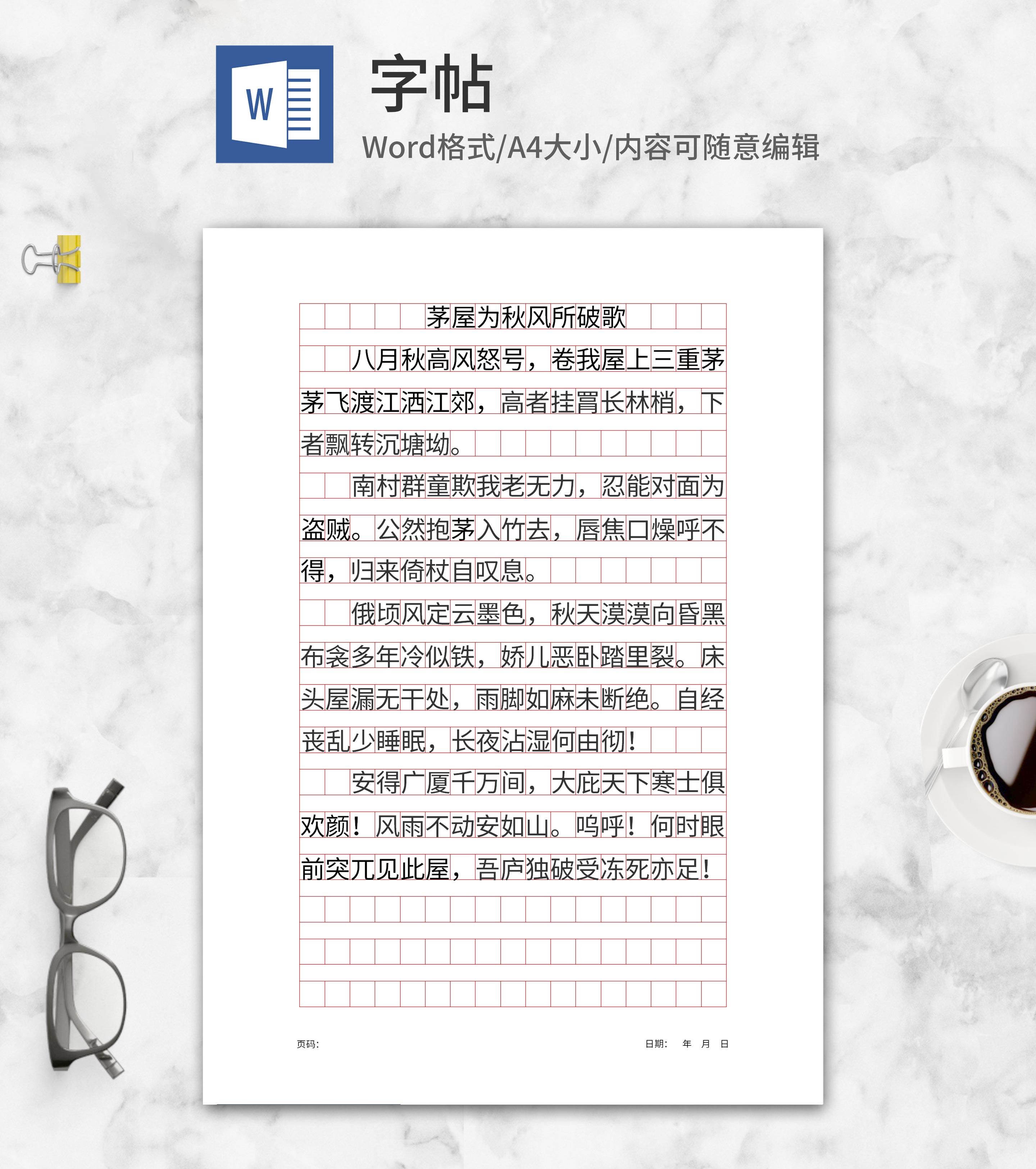 简约《茅屋为秋风所破歌》字帖word模板